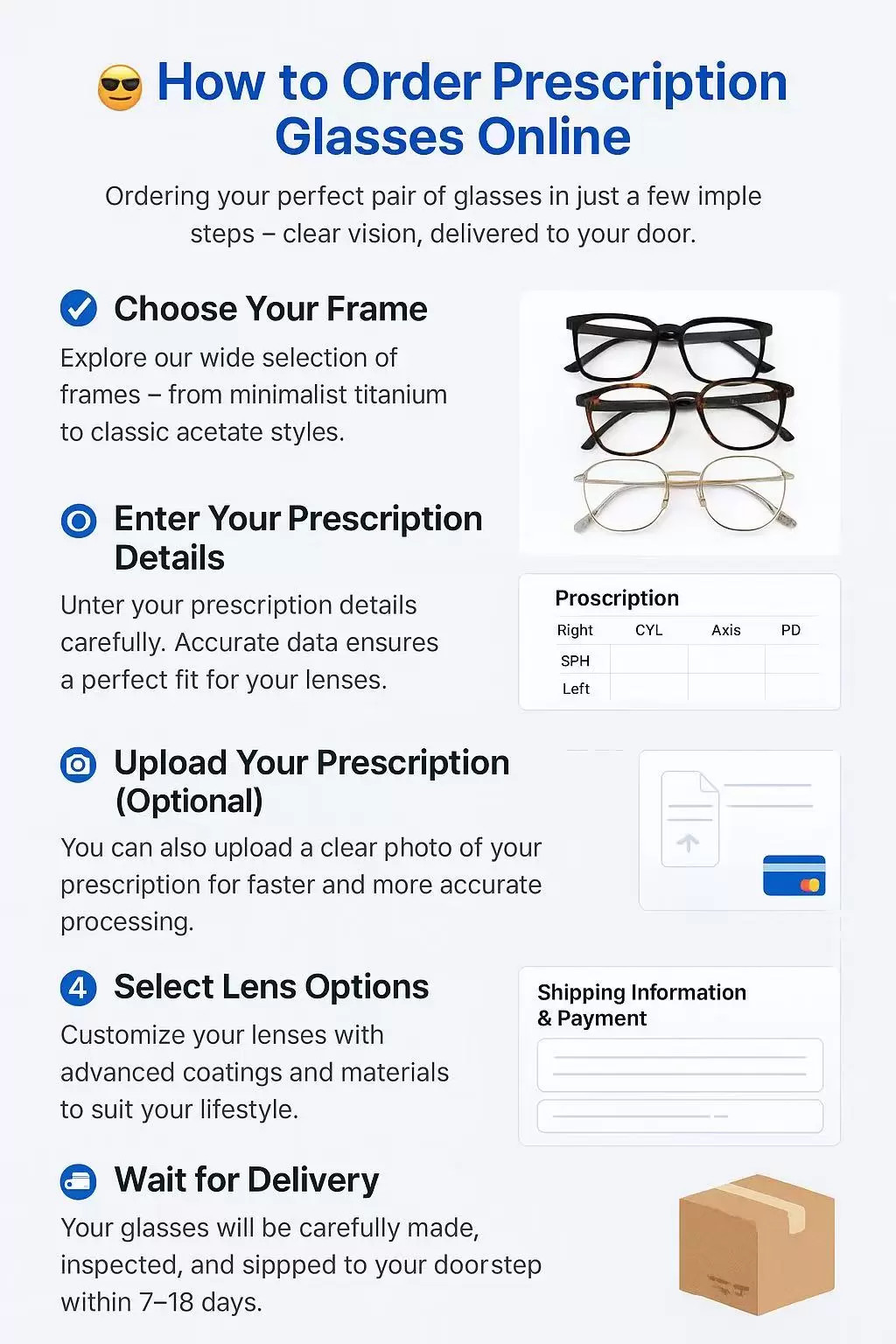 We offers a 365-day warranty starting from the day you receive your eyewear. The warranty covers defects in material and workmanship. It does not cover damage caused by accidents, neglect, or improper care.